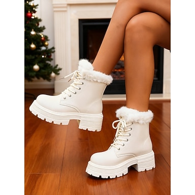 Botas de neve plataforma forradas com pele sintética branca para mulheres – saltos grossos, quentes e elegantes para o inverno, ideais para o Natal e diversão ao ar livre