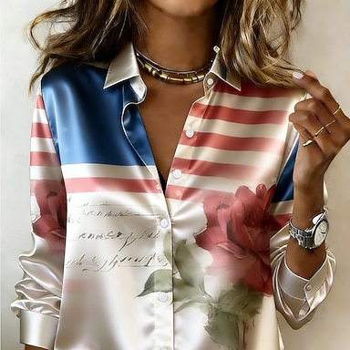 Dia da Independência Americana Mulheres Camisa Social Blusa de cetim camisa de botão Camisa casual Imprimir Floral Gráfico Bandeira americana Boêmia Vintage Moda Manga Longa Colarinho de Camisa Tops