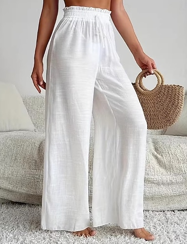 Mulheres Calças Calça casual Calça verão Calças de praia Férias Moda Casual Diário Comprimento total Cintura Alta Côr Sólida Tecido Com Cordão Perna larga Cintura elástica Conforto Macio Respirável