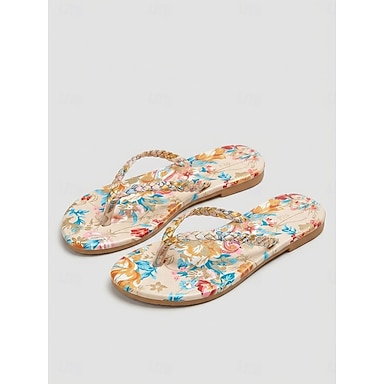 Chinelo feminino estilo boho com estampa floral - sandálias de praia tropicais de verão com tiras trançadas. &Estampas florais vibrantes para férias na ilha &relaxar à beira da piscina