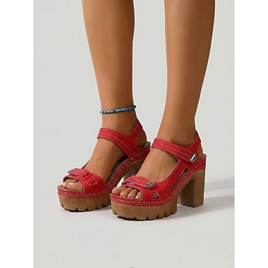 Sandálias femininas vermelhas de plataforma com salto bloco – sandálias de bico aberto com sola tratorada robusta e tira ajustável, calçado casual de verão moderno para viagens e festas no jardim.