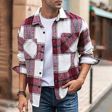 Homens Camisa Social Camisa de flanela Camisola Treliça Ao ar livre Rua Vermelho Verde cáqui Manga Longa Aberto para a Lateral Primavera & Outono Roupa