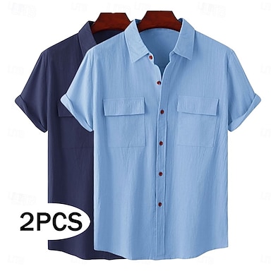 Homens Camisa Social Camisa de linho camisa de verão Roupa de Praia camisa de botão Tecido Férias Casual Preto Branco Rosa Azul Manga Curta Colar de acampamento Verão Roupa