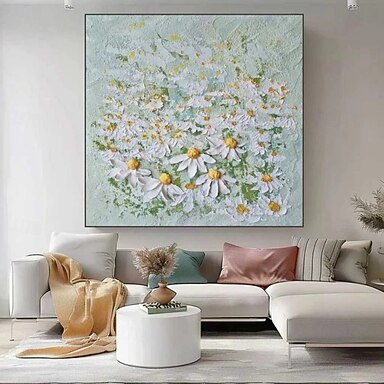 Pintura a óleo artesanal em tela, arte de parede moderna com textura abstrata de flores e margaridas, paisagem para decoração de casa, pintura esticada em moldura ou pintura enrolada sem moldura.