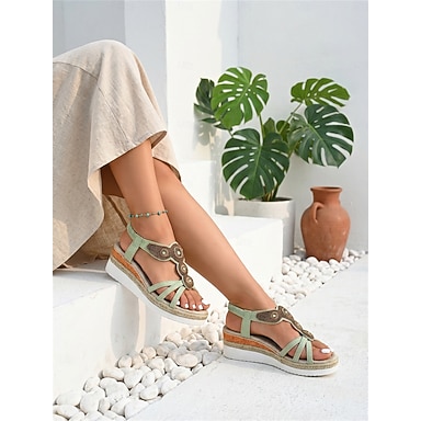 Sandálias femininas verdes boêmias com contas e salto plataforma – sapatos de plataforma estilo étnico para férias de verão, praia e uso casual