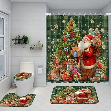 Conjunto de cortina de chuveiro de quatro peças, incluindo assento sanitário antiderrapante e resistente e tapete de banheiro com estampa natalina de Papai Noel e árvore de Natal. Feito em poliéster