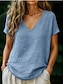 Camisa de Linho Feminina Como Algodão Falso T-Shirt Lisa Moda Básica Moderna Manga Curta Decote em V Tops Regulares Diários Fim de Semana Azul Verão Primavera