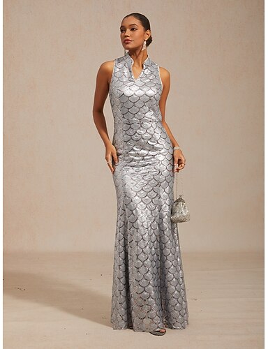 Mulheres Vestido Longo Vestido da bainha Elegante Gráfico Sem Manga Colarinho Chinês Prata