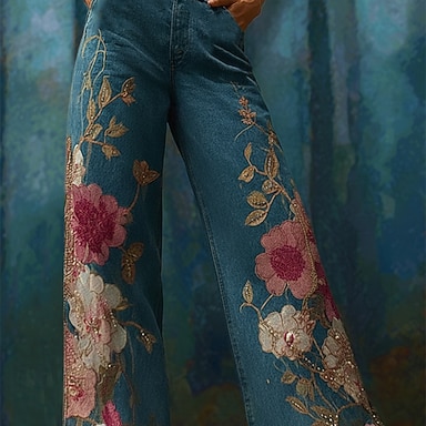Mulheres Perna larga chinês Férias Vintage Estilo Étnico Comprimento total Cintura Alta Floral Gráfico Bolsos Estampado Confortável Macio Micro-Elástica Ao ar livre Férias Rua Azul Primavera Outono