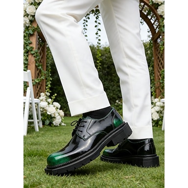Sapatos sociais masculinos em couro sintético envernizado preto e verde, design moderno e elegante, perfeitos para festas, eventos formais e casamentos.