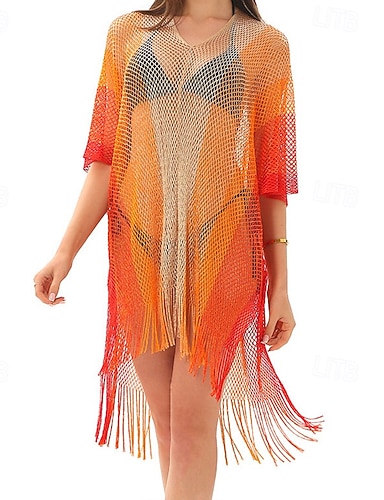 Mulheres Roupa de Banho Cobertura roupa de banho Bainha com franja Com Corte Férias Roupa de Praia Âmbar Decote V Manga Curta Fatos de banho