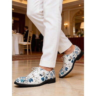 Sapatos sociais masculinos brancos com estampa floral azul bordada, modelo oxford com cadarço, estilo elegante e formal para casamentos, festas e ocasiões especiais.