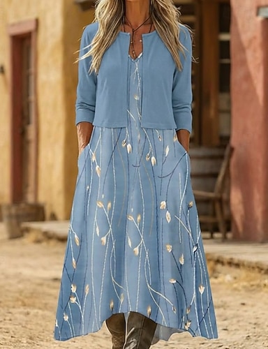 Mulheres Vestido Longo Vestido Maxi Vestido casual Vestido estampado Vintage Moda Diário Encontro Final de semana Normal Flor Manga Longa Gola Redonda Azul Cinzento Escuro Primavera Outono
