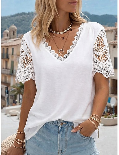 Mulheres Camiseta Camiseta de renda T-shirt Renda Tecido Moda à moda Clássico Manga Curta Decote V Tops regulares Diário Para Noite Final de semana Azul Branco Amarelo Rosa Vermelho Verão Primavera