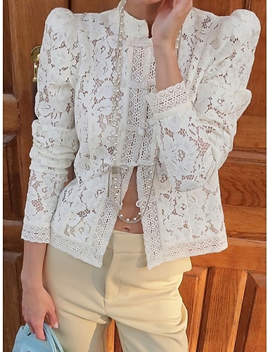 Mulheres Blusa Topo de ilhó Tops de renda Vazado Botões Tecido Diário à moda Básico Manga Longa Colarinho de Camisa Tops regulares Diário Trabalho Feriado Branco Primavera Outono