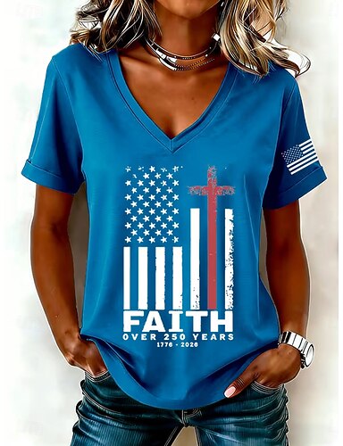 Camiseta Patriótica Feminina do Dia da Independência Estampa Gráfica Bandeira Vintage Estilosa Clássica Manga Curta Gola V Tops Regulares Impressão Diária Azul Preto Branco Rosa Verão Primavera