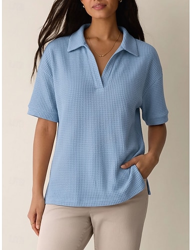 Mulheres Camiseta Camisas Polo Camisetas Tops de tricô waffle Tecido Moda à moda Básico Manga Curta Colarinho de Camisa Tops longos Casual Diário Para Noite Azul Preto Branco Amarelo Laranja Verão
