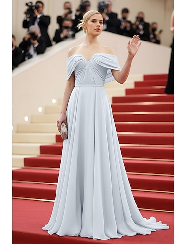 Linha A Cauda Escova Vestido formal Vestido de noite Vestidos de noite Elegante Sem Manga Ombro a Ombro Baile de Formatura Formal Cetim com Cor Única