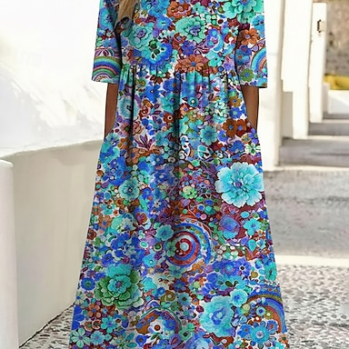 Mulheres Vestido midi Vestido casual Vestido estampado Vintage Ao ar livre Férias Para Noite Ajuste Largo Floral Gráfico Meia Manga Gola Redonda Azul Roxo Claro Roxo Verde Verão Primavera