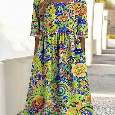 Vestido Maxi Feminino Linho Semelhante Respirável Leve Kaftan Manga 3/4 Decote Redondo Vestido Casual Vestido em A Boho Solto Gráfico Floral Decote em V Branco Amarelo Verde Claro Verde Primavera