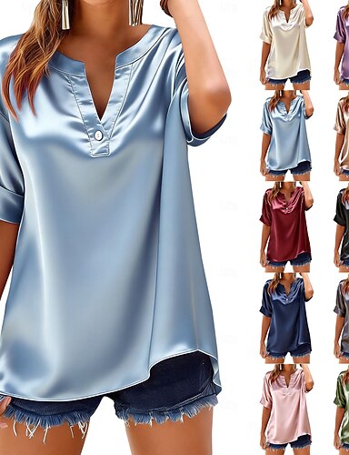 Mulheres Camisa Social Blusa de cetim Saia Côr Sólida Tecido Férias Vintage Moda Manga Curta Decote V Tops regulares Diário Streetwear Trabalho Azul Preto Rosa Vermelho Azul Marinha Verão Primavera