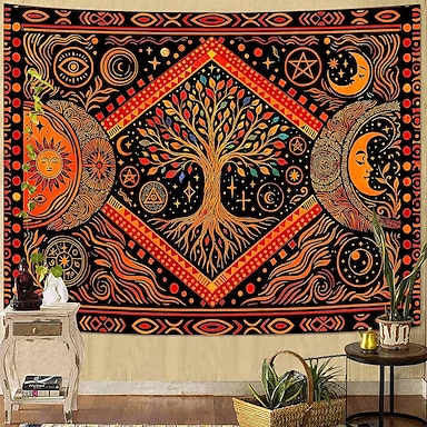 Tapeçaria de parede celestial com árvore da vida, sol e lua, símbolos místicos e ocultos, laranja e preto, estilo boho, decoração para casa, quarto, sala de estar, cenário para yoga.