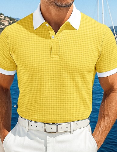 Homens Camisa de golfe Polos Piquê O negócio Casual gola pólo com nervuras Manga Curta Moda Básico Xadrez Bloco de cor Botões Logotipo Verão Primavera Primavera & Outono Normal Amarelo Azul Escuro