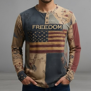 4 de Julho de 2026 250º Dia da Memória Camiseta Masculina Bandeira dos EUA Henley Manga Longa Casual Diário