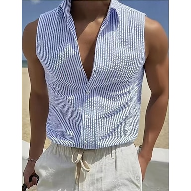 Homens Camisa Social Camisa casual Camisa de algodão camisa de botão Azul Preto Branco Verde Claro Rosa Sem Manga Riscas Tiras verticais Colarinho de Camisa Casual Diário Botões Roupa Elegante Moda
