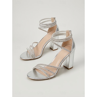 Sandálias femininas prateadas com salto bloco e tiras, sapatos elegantes com tira no tornozelo e salto grosso para festas de coquetel e formaturas. &eventos noturnos