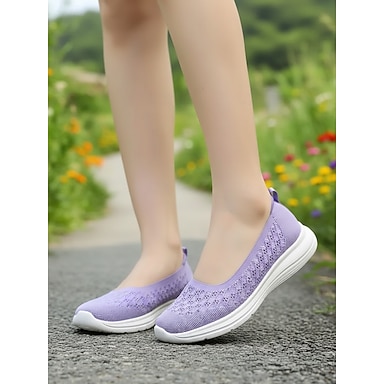 Tênis slip-on feminino roxo de tricô – calçado leve, respirável e confortável para caminhada, ideal para uso diário, viagens e looks casuais.