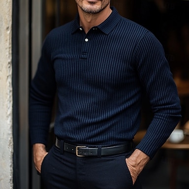 Homens Top de malha canelada Textura O negócio Casual gola pólo com nervuras Manga Longa Moda Básico Côr Sólida Tricôt Outono Inverno Fino Branco Azul Marinho Verde Cinzento Top de malha canelada