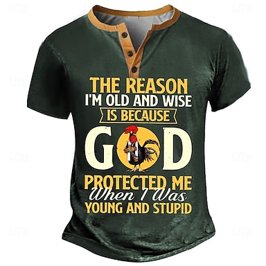 Camiseta Gráfica Masculina Henley Engraçada 'Velho e Sábio Deus me Protegeu' Citação Presente de Estilo de Vida de Manga Curta