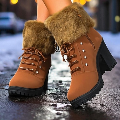 Botas femininas marrons de couro sintético acima do joelho com acabamento em pele sintética – botas estilosas de salto bloco com cadarço para o inverno, neve e uso diário ao ar livre.