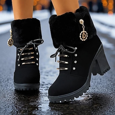 Botas femininas de cano curto em malha preta com cadarço e strass e salto grosso - botas elegantes de inverno com salto para roupas de Natal e moda para o frio