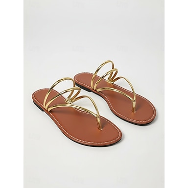 Sandálias rasteiras femininas douradas metálicas com tira em T - sandálias de dedo chiques em couro sintético com tira ajustável no tornozelo, ideais para resorts de luxo ao ar livre. &férias na praia
