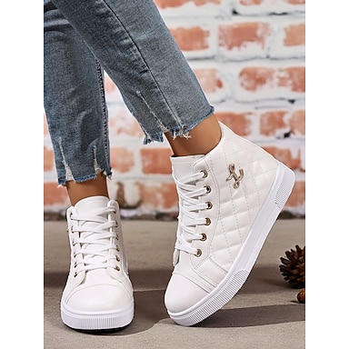 Tênis feminino branco acolchoado de cano alto, sapatos plataforma com cadarço e detalhes dourados, calçados casuais estilosos para uso diário e passeios