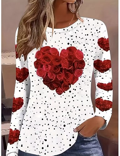 Dia dos Namorados Mulheres Camiseta Imprimir Coração Gráfico Moda à moda Clássico Manga Longa Gola Redonda Decote Redondo Tops regulares Diário Final de semana Branco Vermelho Verão Primavera Outono