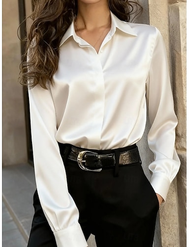 Blusa feminina de cetim com botões, cor sólida, elegante, estilosa, casual, manga longa, gola, tops regulares para o trabalho no escritório, nas cores preto, branco, azul marinho e cinza, para
