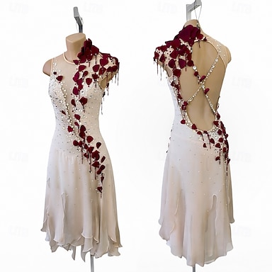 Vestidos para Patinação Artística Mulheres Para Meninas Patinação no Gelo Vestidos Vermelho Escuro Branco Rosa claro Flor Sem costas Com Transparência Ensaio / Prática Competição Roupa para Patinação