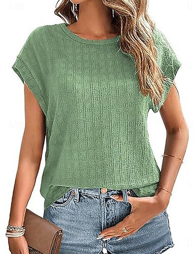 Mulheres Camiseta T-shirt Tecido Moda à moda Clássico Manga Curta Gola Redonda Tops regulares Diário Para Noite Final de semana Verde Sage Preto Branco Vinho Verde Verão Primavera