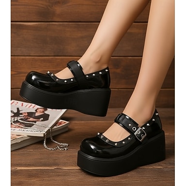 Sapatos femininos Mary Jane pretos com plataforma e tiras cravejadas – saltos grossos estilo punk gótico para Halloween, cosplay e moda alternativa