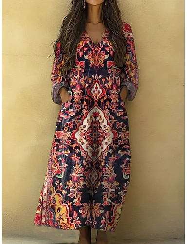 Mulheres Vestido Longo Vestidos Para o Verão Vestido A Line Casual Boho Feriado Ajuste Largo Gráfico Geométrica Manga Longa Decote V Rosa Azul Roxo Verde Verão Primavera Outono