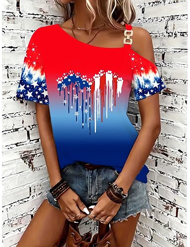 Dia da Independência Americana Mulheres Camiseta Imprimir Assimétrico Gráfico Bandeira americana Vintage Moda Casual Manga Curta Assimétrico Tops regulares Diário Para Noite Final de semana Azul
