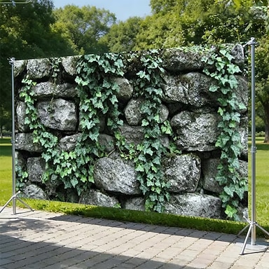 parede de pedra rústica com hera verde trepadeira, pedras cinza naturais, textura realista, banner para porta de garagem, tapeçaria de parede para jardim, quintal, pátio, cerca e decoração de casa.
