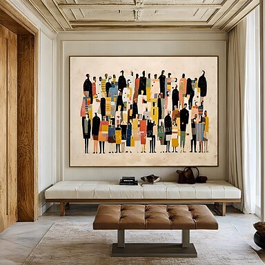 Pintura abstrata de multidão, figuras urbanas texturizadas, tela multicolorida bege, arte boho para sala de estar