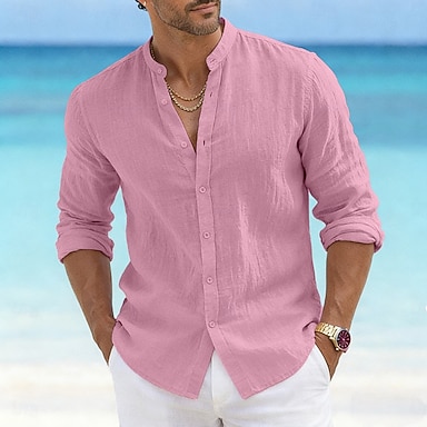 Homens Camisa Social camisa de verão Roupa de Praia camisa de botão Tecido Casual Diário Preto Branco Rosa Laranja Manga Longa Colarinho Mandarim Verão Primavera Verão Roupa Puro