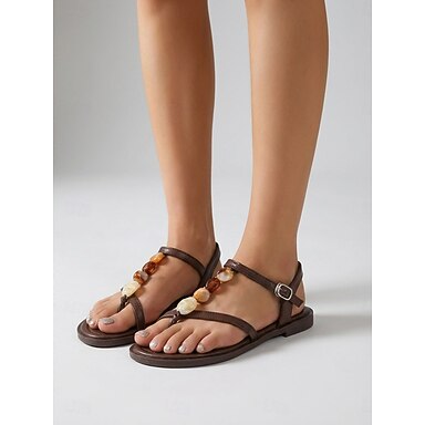 Sandálias femininas marrons estilo boho com tiras e aplicações de pedras artificiais - calçados de praia confortáveis e rasteiros com tira no tornozelo, ideais para férias de verão e viagens para