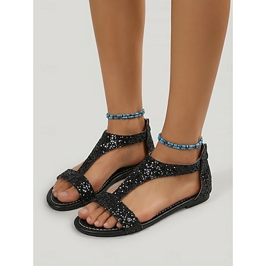 Sandálias rasteiras pretas com tira em T e glitter para mulheres - um toque chique e brilhante perfeito para férias na praia, passeios à beira-mar e viagens para ilhas tropicais.