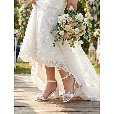 Sapatos de noiva mule de bico aberto com detalhes florais, elegantes e texturizados, perfeitos para casamentos ao ar livre no jardim. &cerimônias no gramado